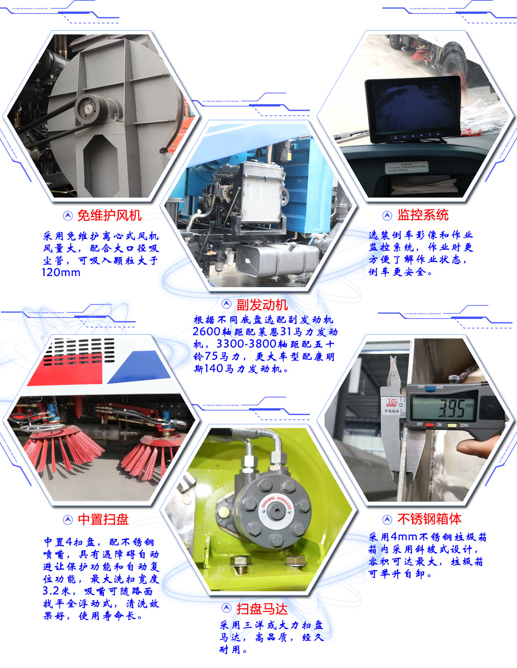 洗掃車、掃路車作為環(huán)衛(wèi)設備之一,是一種集路面清掃、垃圾回收和運輸為一體的新型高效清掃設備。可廣泛應用于干線公路,市政以及機場道面、城市住宅區(qū)、公園等道路清掃。路面掃路車不但可以清掃垃圾,而且還可以對道路上的空氣介質進行除塵凈化,既保證了道路的美觀,維護了環(huán)境的衛(wèi)生,維持了路面的良好工作狀況,有減少和預防了交通事故的發(fā)生以及進一步延長了路面的使用壽命。在國內利用路面掃路車進行路面養(yǎng)護已經成為一種潮流。